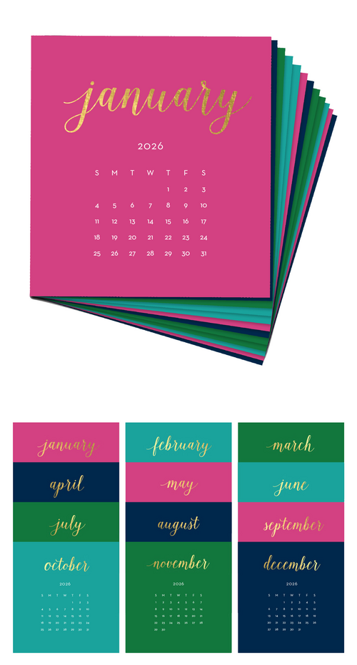 Each month of this 2026 Stacy Claire Boyd desk calendar is hand-pressed in gold foil and printed on heavy stock paper of alternating four bright colors. Easel not included.