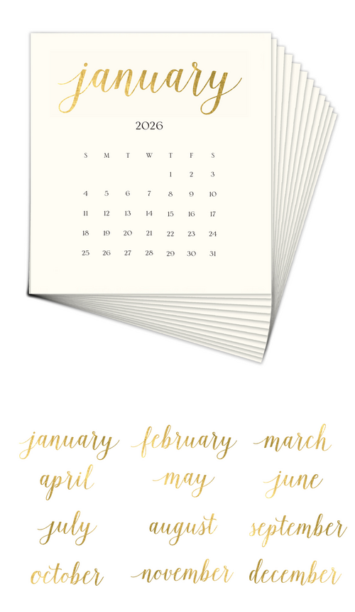 Each month of this 2026 Stacy Claire Boyd desk calendar refill is hand-pressed in gold foil and printed on cream heavy stock paper. Easel not included.