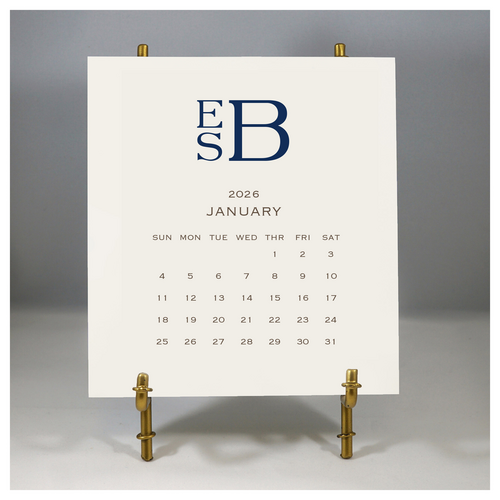 Each month of this 2026 Stacy Claire Boyd desk calendar contains your personalized text and is printed on cream heavy stock paper. Includes bamboo-inspired gold metal easel. Packaged in an acrylic top box ready for gifting!